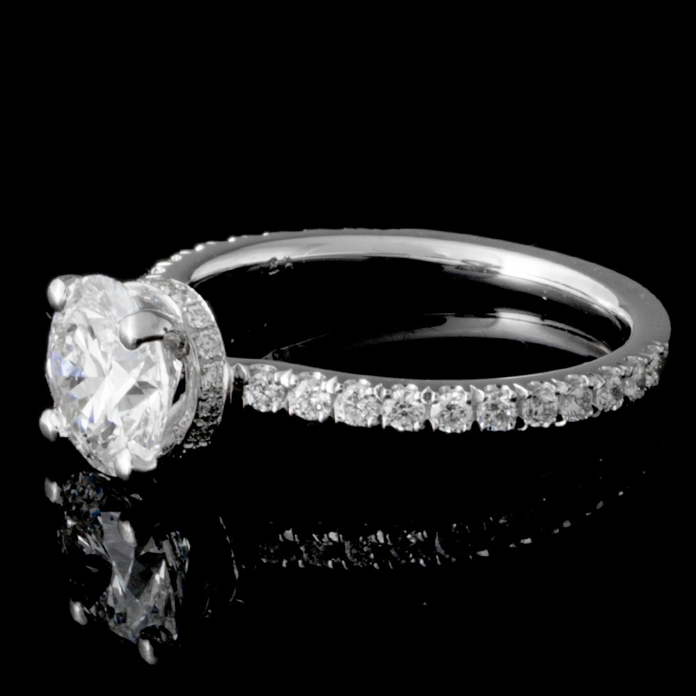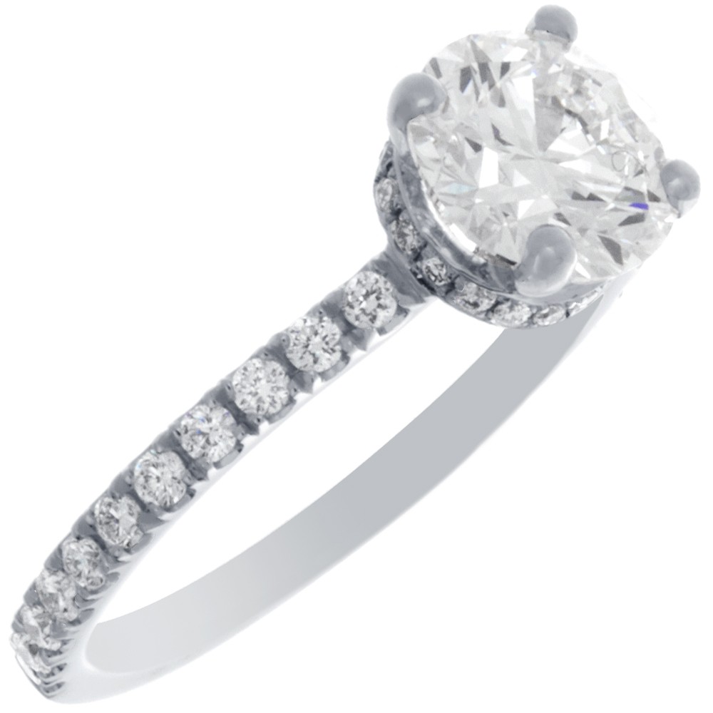 Ladies 14K white gold custom design diamond engagement ring originally rendered by three-dimensional computer design. The ring features 0.40 carats (40 Dia) of premium cut round diamond brilliants of approximately F/ G color and VS2 clarity that are micro- u-pave and pave'set three quarters along each side of the shank and around the side halo of the setting. The approximate diamond quality of the side diamonds are F/G color and VS2 clarity. Also featured is a 1.34 Carat round diamond brilliant that is GIA certified F color VS1 clarity with a triple excellent cut grade. Lastly the ring is custom fit for a finger size of 6 and includes a "14K" stamp located inside the shank to signify the authenticity of the gold karat.
