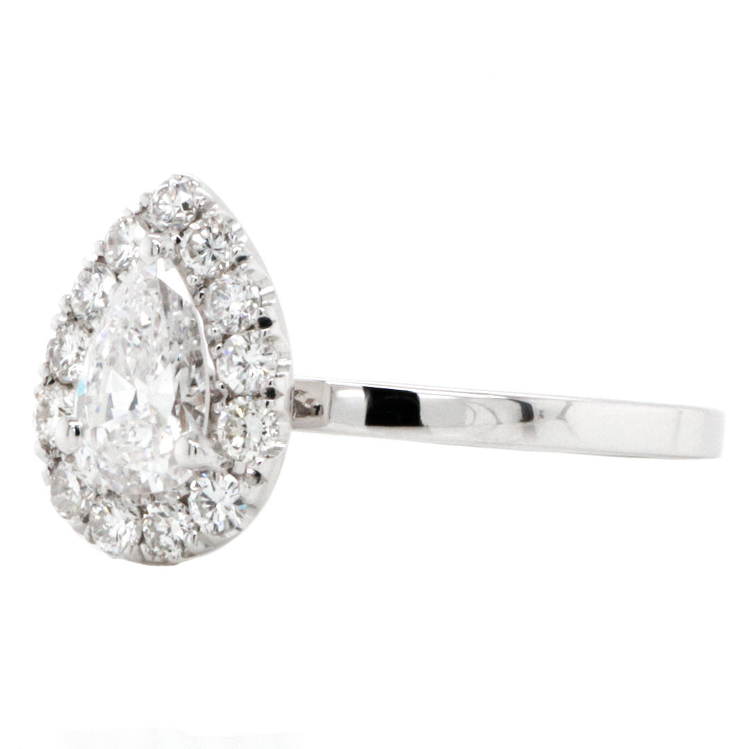 Ladies custom design 14k white gold custom design pear shape halo ring originally rendered by a three-dimensional computer aided design specialist. The ring features 0.48 carats (13 DIA) of natural round brilliant cut side diamonds, approximately G/SI1 quality all micro-pavé set in the u-set fashion circulating / surrounding the pear shape center diamond in a halo fashion. Also featured and mounted in the center is a 0.71 carat natural pear shape brilliant, approximately E/SI1 clarity, mounted and secured on three prongs. The ring also includes a 1.90 MM simple (no diamonds) polished shank that is custom fit for a finger size 9 and includes a "14K" stamp to signify the authenticity of the gold karat.