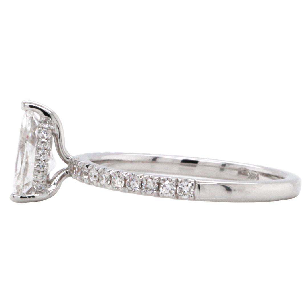 This Special Order, custom designed via 3D CAD, Ladies Diamond Engagement Ring in 14K White Gold showcases a solitaire design with a 1.02ct Pear Shaped Diamond, graded E Color and SI1 Clarity. This natural diamond, certified by EGL with certificate number US 923951901D, measures 8.42 x 5.70 x 3.42 mm. It is complemented by 0.33ct total weight across 37 additional natural diamonds with approximately E-F color and SI1 clarity, all set in a u-shaped pavé on the hidden halo and halfway through the band. The band measures 1.90mm in width and the ring weighs 3.10 grams in total. It is sized at 7 and stamped "14k" to confirm its authenticity of the gold karat.