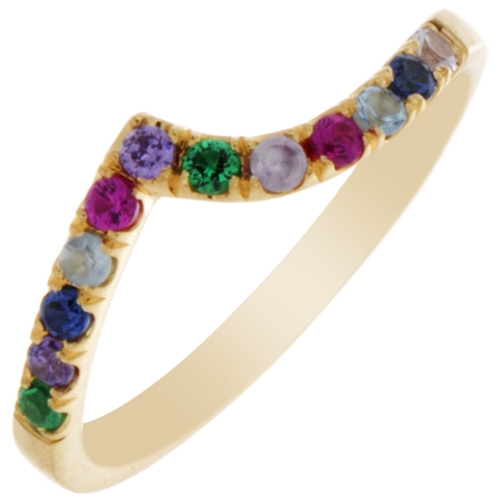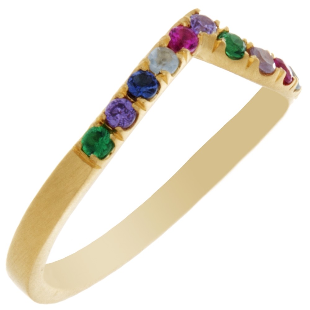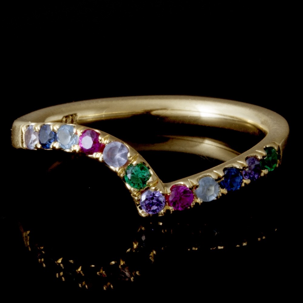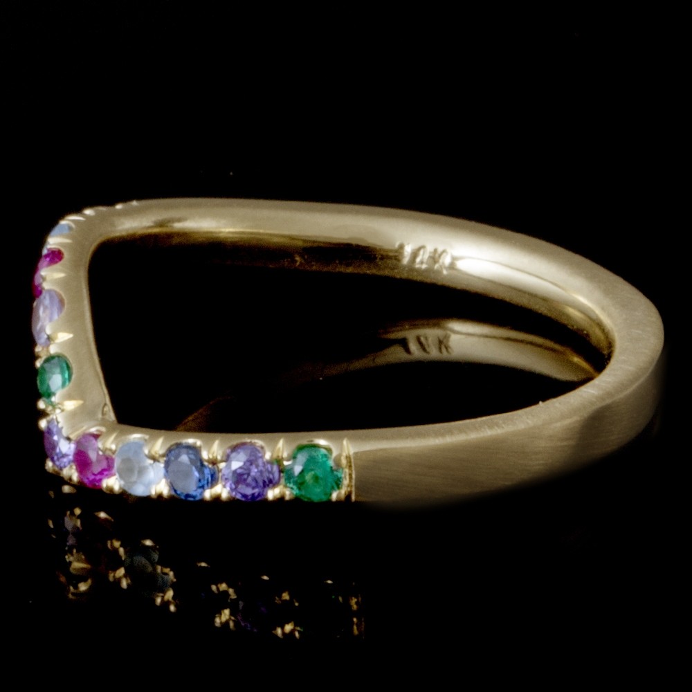 Featuring a 14k yellow gold ring set with assorted gemstones that are set by hand in a U-shape micro pave fashion.