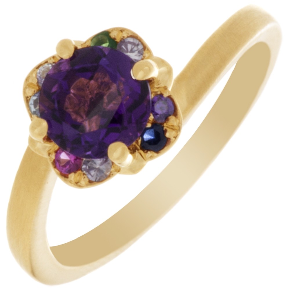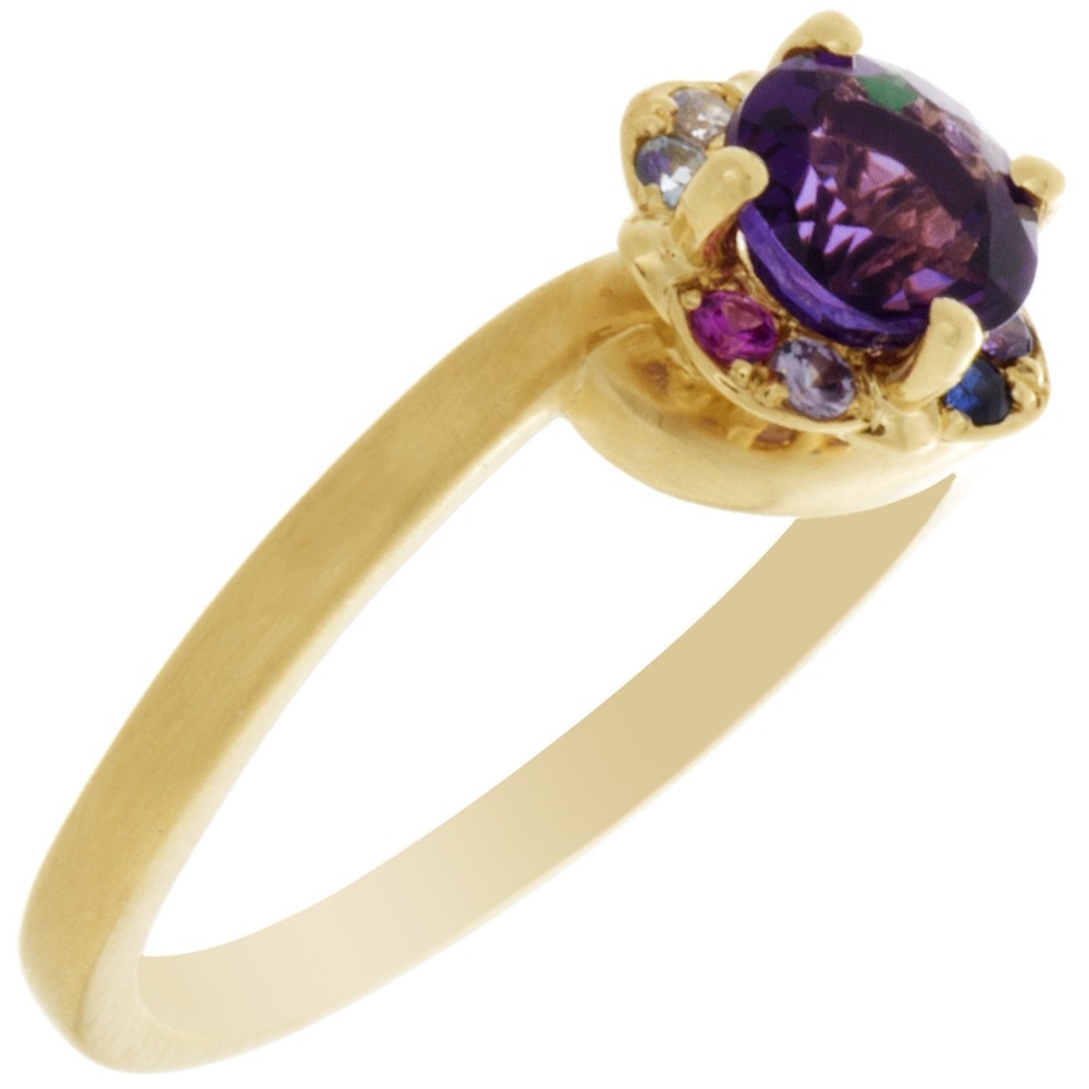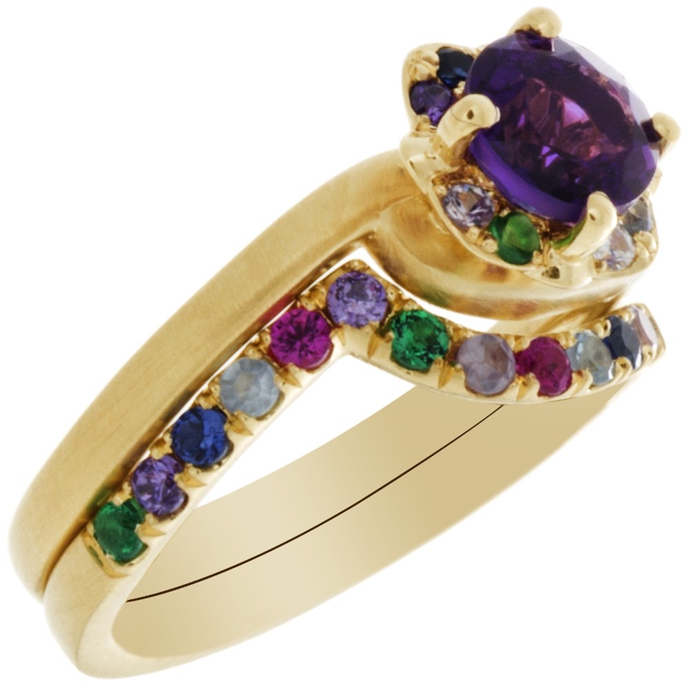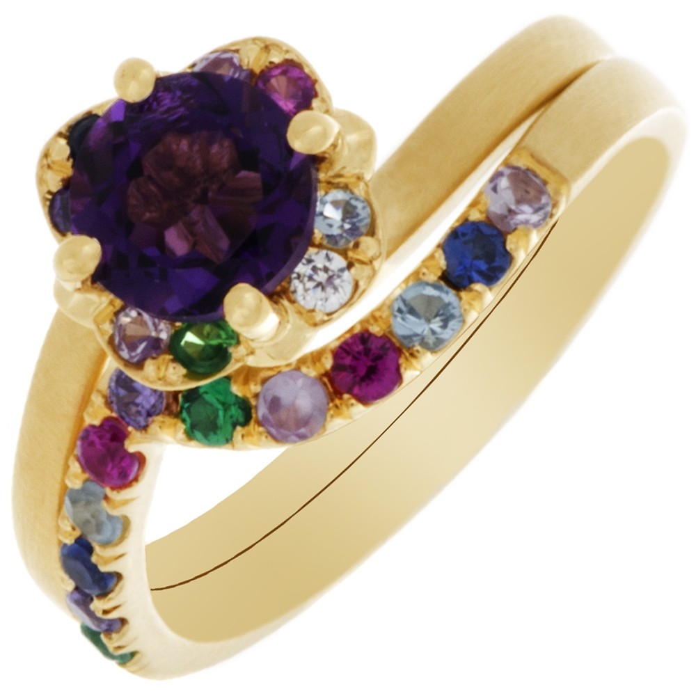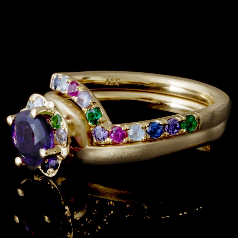 Featuring a 14k yellow gold ring set with assorted gemstones that are set by hand in a U-shape micro pave fashion.