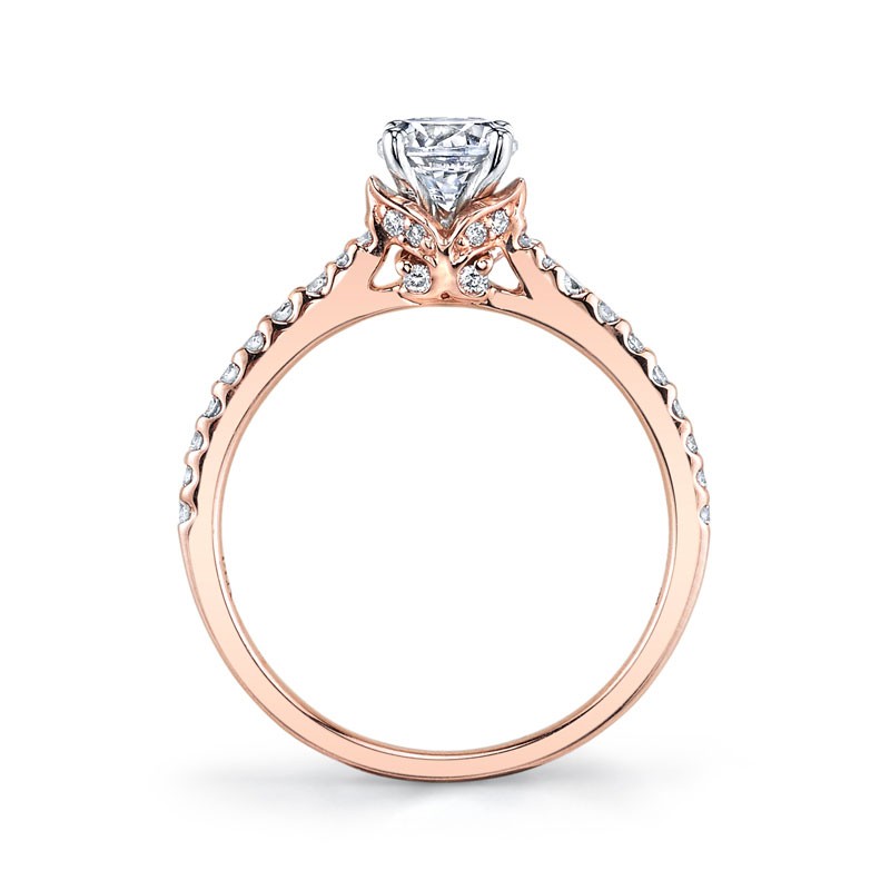 A unique engagement setting with diamond pave single row shank. This engagement setting features a diamond embellished butterfly detailing. Shown in Rose Gold with Round 0.65 Carat; Center excluded from Price. Side stones: 0.29 Carat Weight Total.