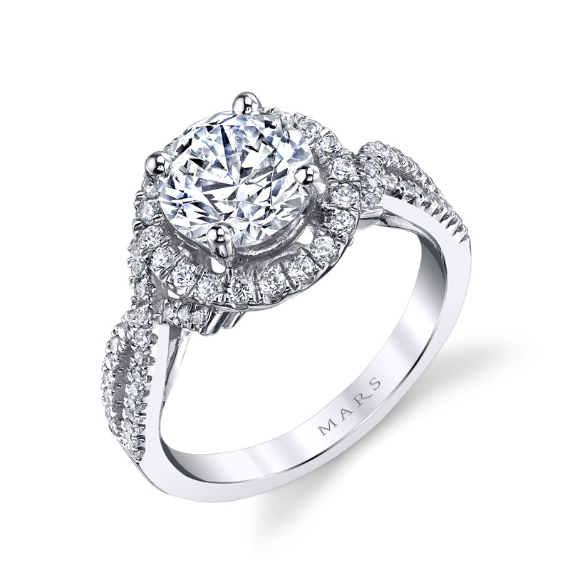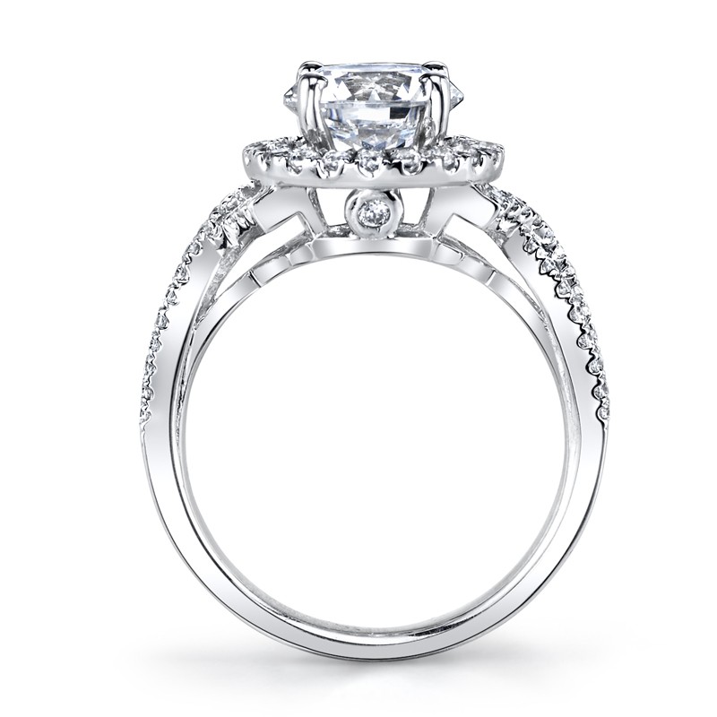 An Ornate round halo engagement setting with interwoven shank and peek-a-boo side diamonds. This engagement ring features an: Embellished Round Halo; Infinity Diamond Shank; Peek-A-Boo Diamond Accent Stones. Shown in White Gold with a Two Carat Round Brilliant Cut Center Stone; Price does not include center stone. Side Stones: 0.51 Carat Total Weight.